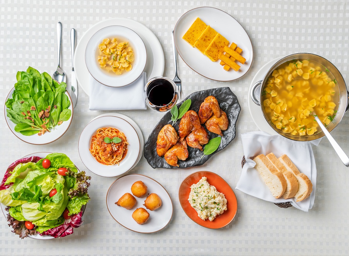 crocante, sopa de capeletti, saladas frescas, sete tipos de