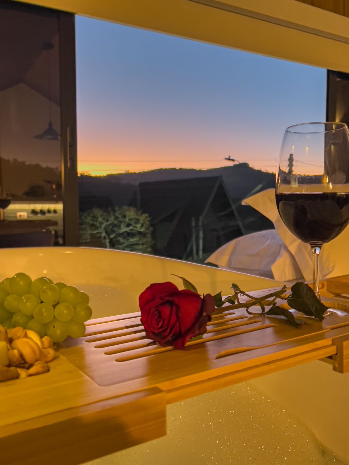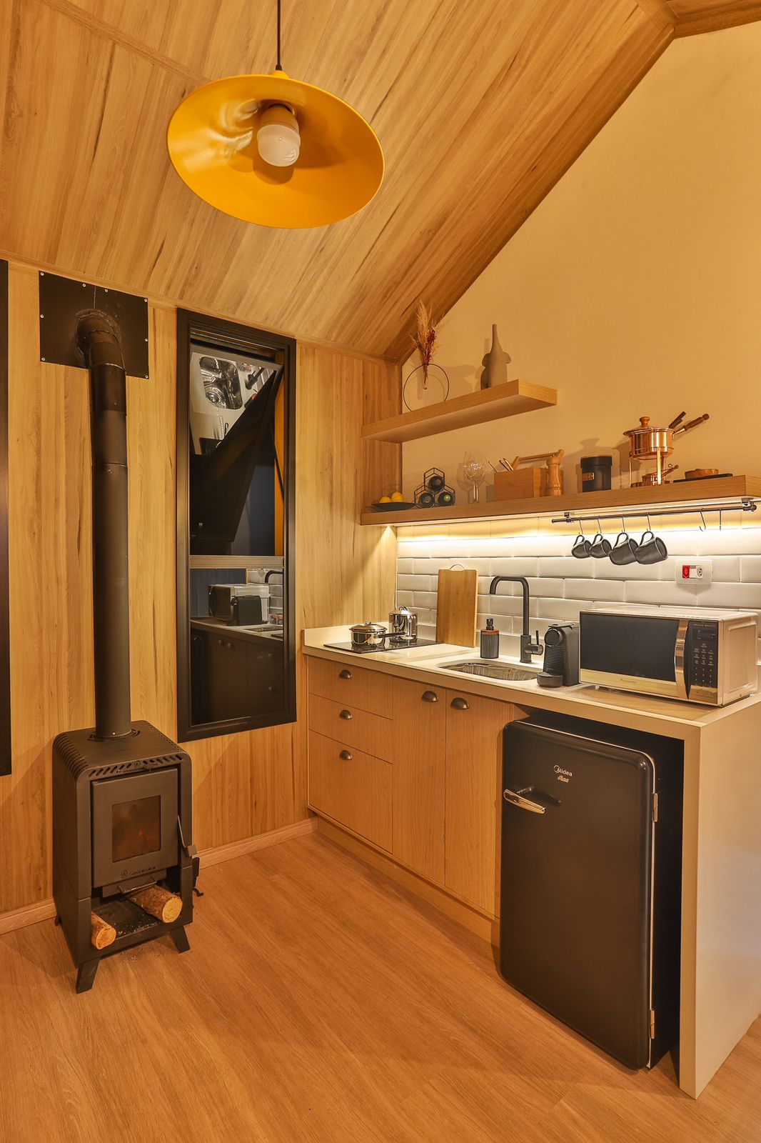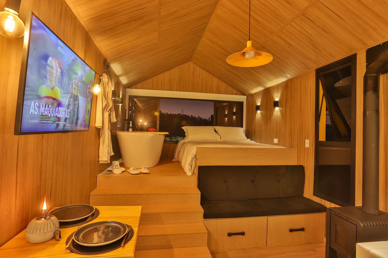 O espaço conta com Tv 43 polegadas com Netflix, cooktop de indução, iluminação controlada pela Alexa, água com aquecimento a gás, lareira calefator a lenha natural, toalheiro aquecido, banheira de imersão, itens de cozinha, panela de fondue, taças e vista para as montanhas.